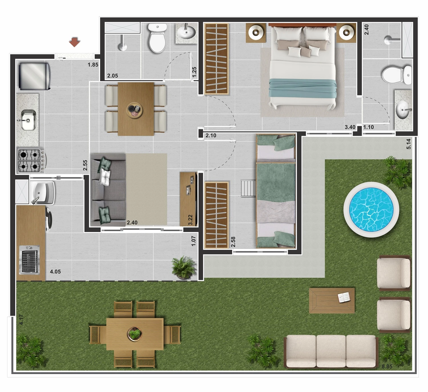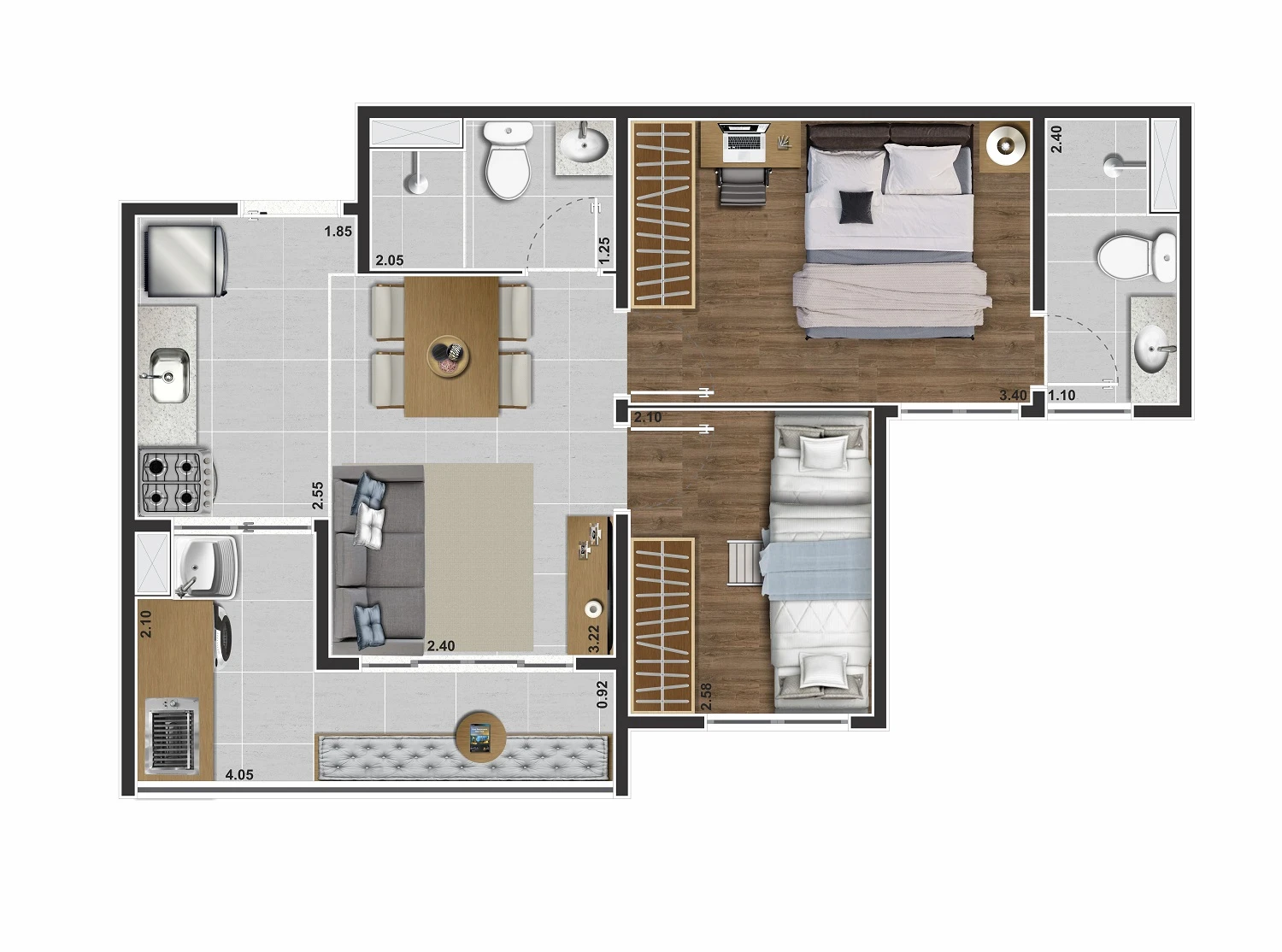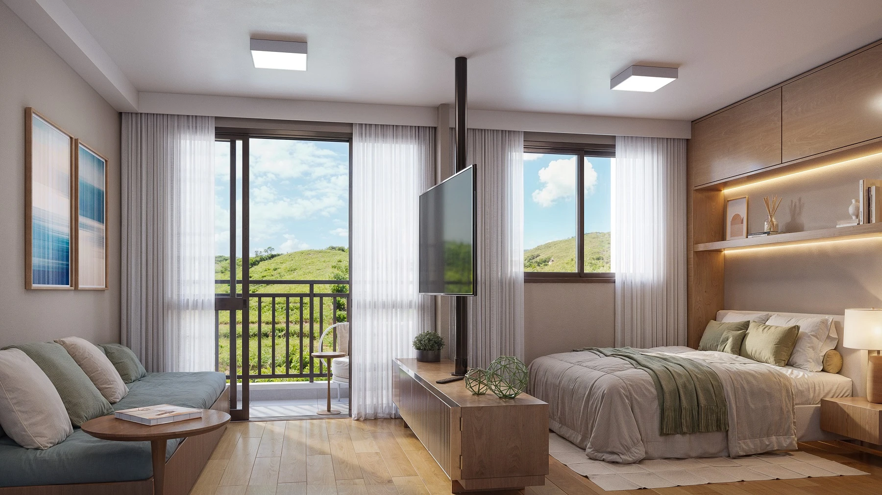 Unidades de 27,94m² | 71,19m² - 1, 2 quartos, e 2 quartos com suíte.