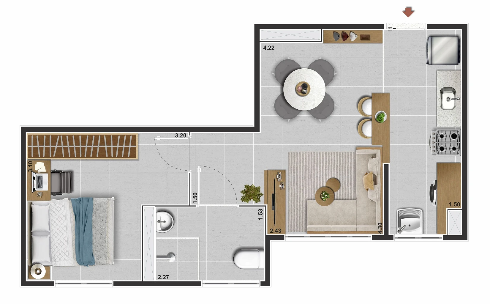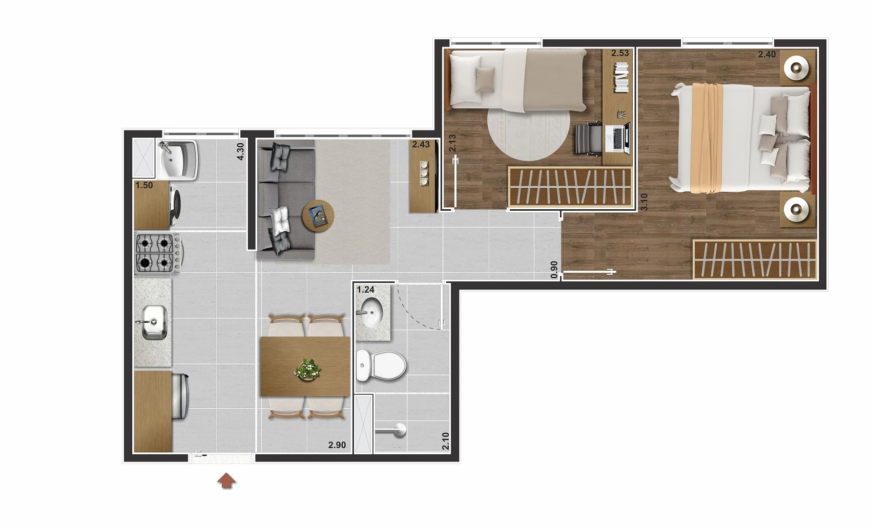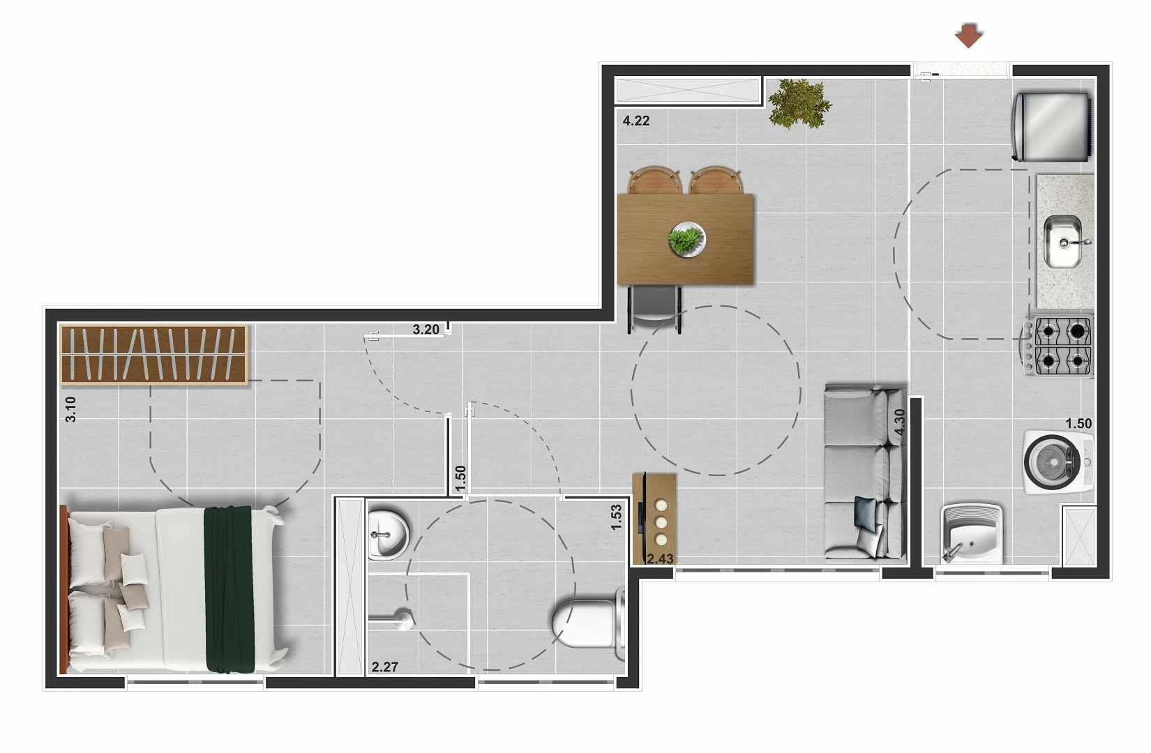 Unidades de 27,94m² | 71,19m² - 1, 2 quartos, e 2 quartos com suíte.